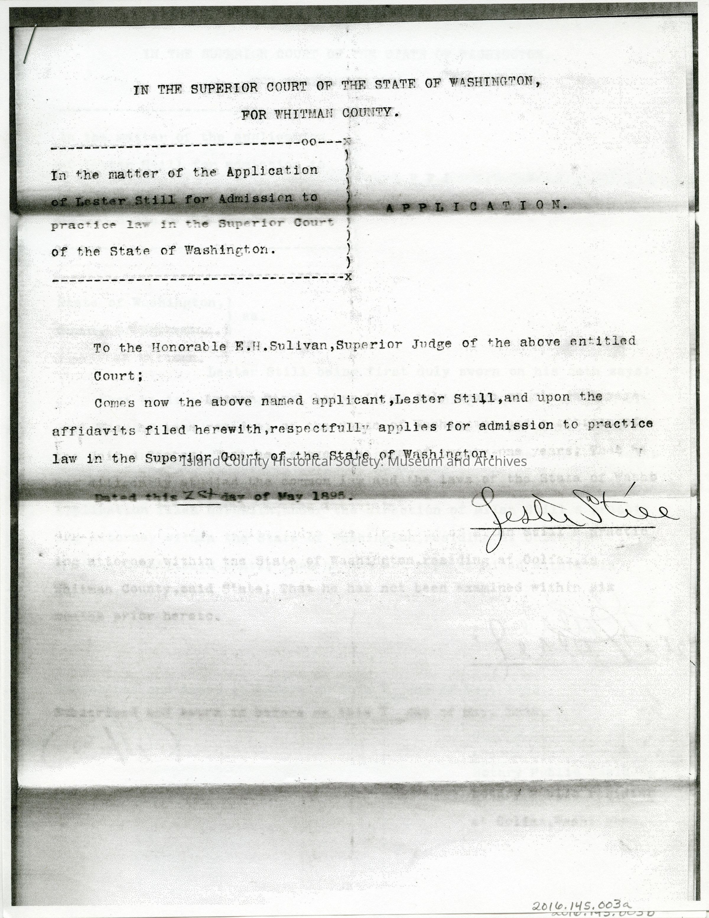 A copy of the letter that entitles Judge Still to practice law in the Superior Court of Washington. 2 May, 1895. Three pages.