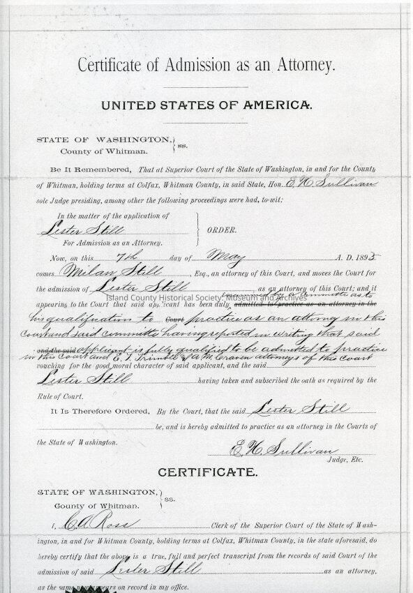 A copy of the certicate that entitles Judge Still to practice law in as an attorney in the Superior Court in Whitman County, Washington. 7th May, 1893.