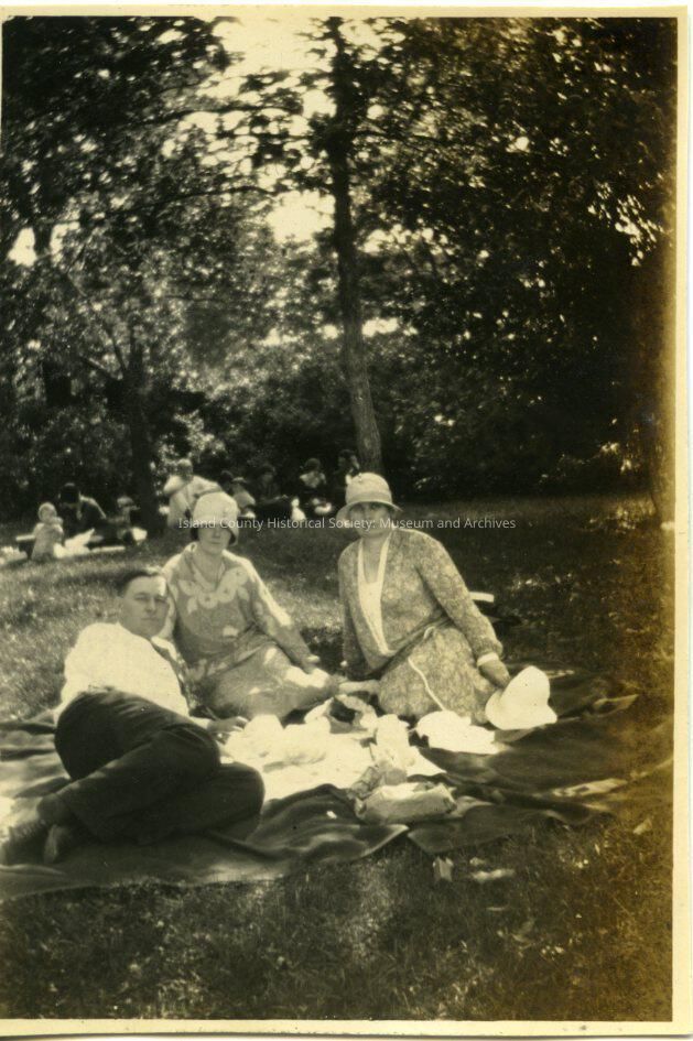 A black and white photo of a group of three people having a picnic. There are two females and one male. The women are both wearing dresses and hats. They have a blanket laid on on the grass. There are about seven or eight people visiable behind them.