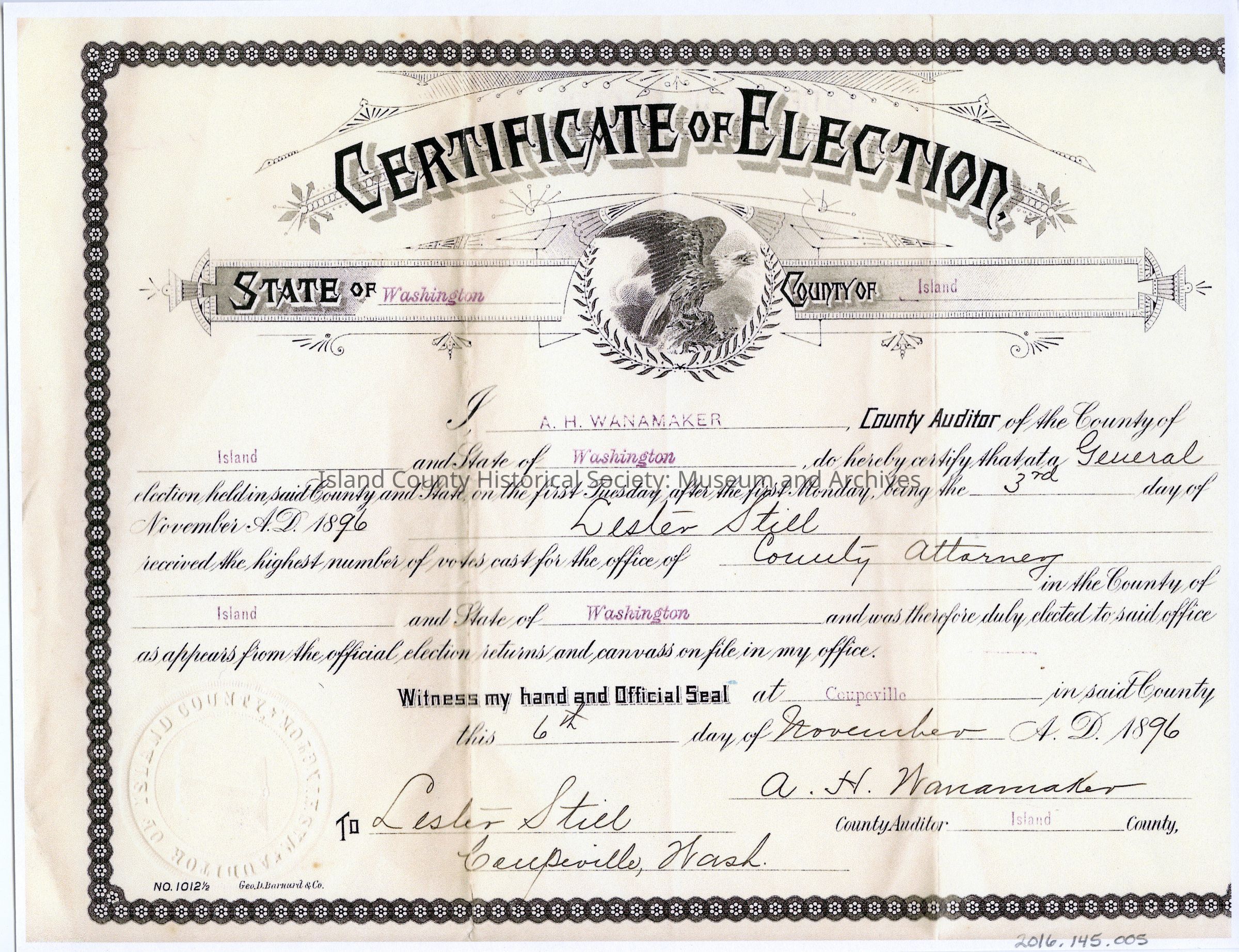 A copy of the certicate of Election that Judge Still was elected as the County Attorney for Island County, Washington. 6th November, 1896.