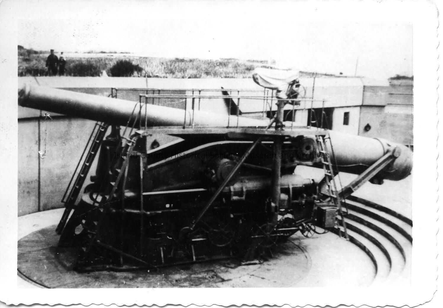 Ft. Worden. Large gun retracted. Notes on envelope read: 12" DCLF M1901, Btry Kinzie, Ft. Worden. From old entry: Photo of large disappearing gun with negative