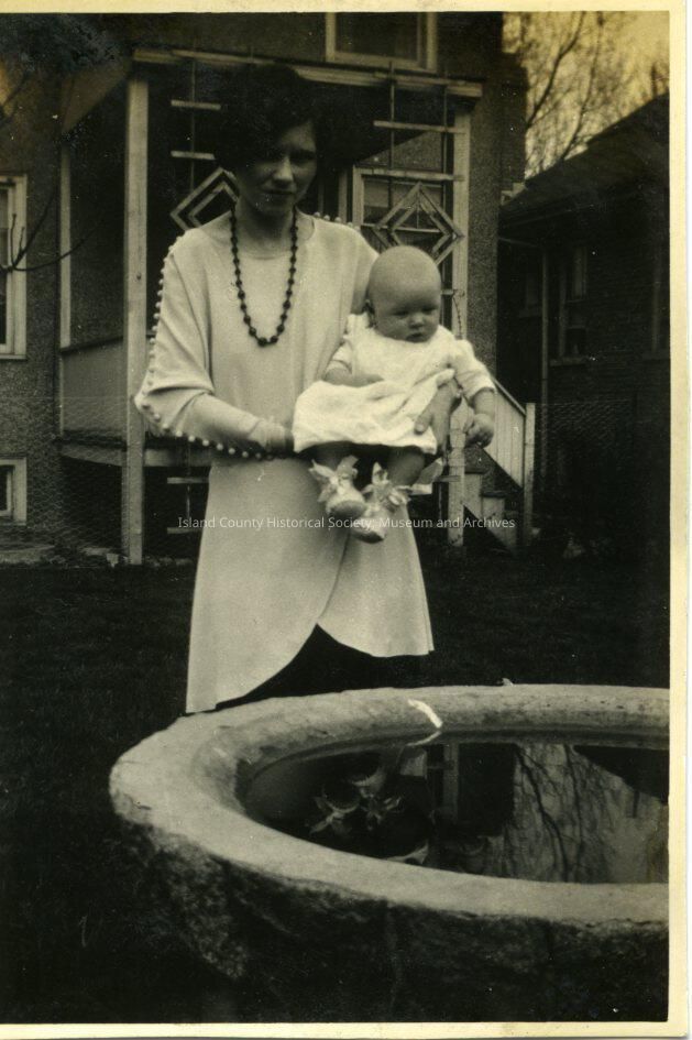 A black and white photo of a woman holding a baby. The woman is standing in front of a building and is by a stone structure holding water. Possibly a fountain. The woman and the baby are both wearing white. Alida and Howard Kellogg Jr. He was born December 1930.