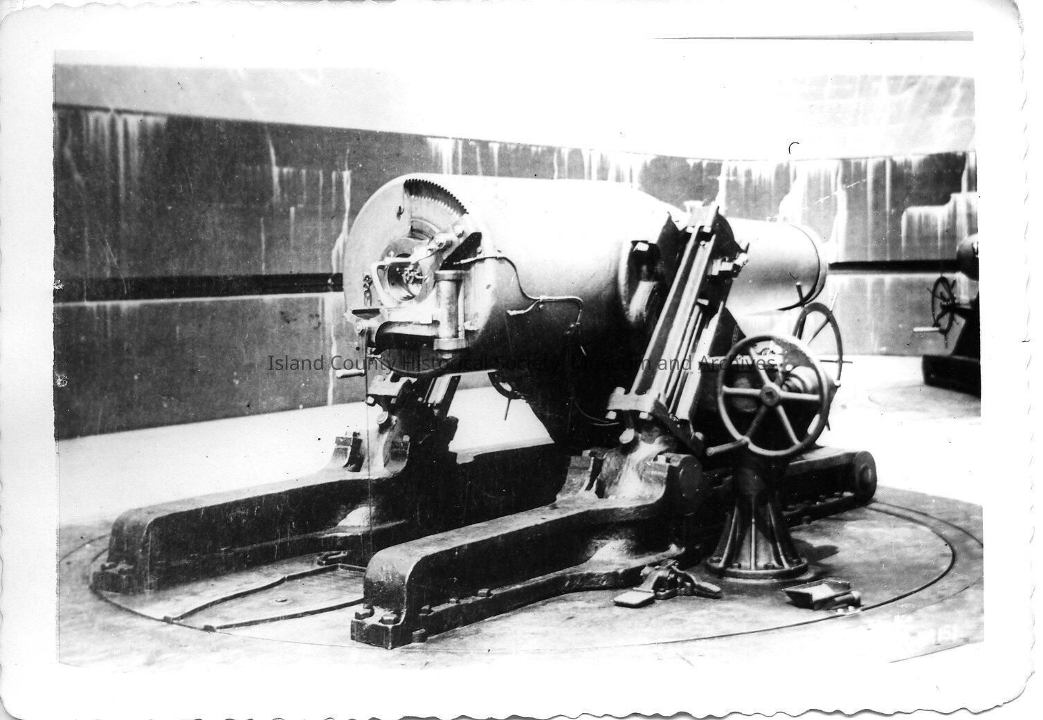 Large gun retracted in emplacement. Notes on envelope read: Ft. Worden.