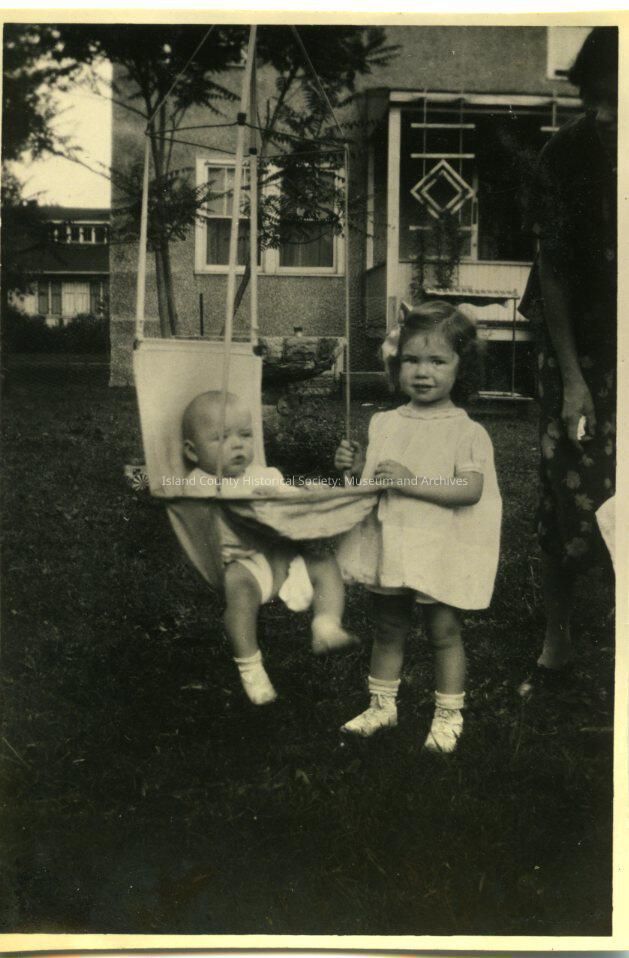 A black and white photo of a little girl standing next to a baby boy in a swing-chair handing from a tree. Both children are wearing all white. There is an adult woman next to them but she is cut out of the picture. Looks like the are in someones backyard. Patricia (Patsy) Kellogg and Howard Jr.