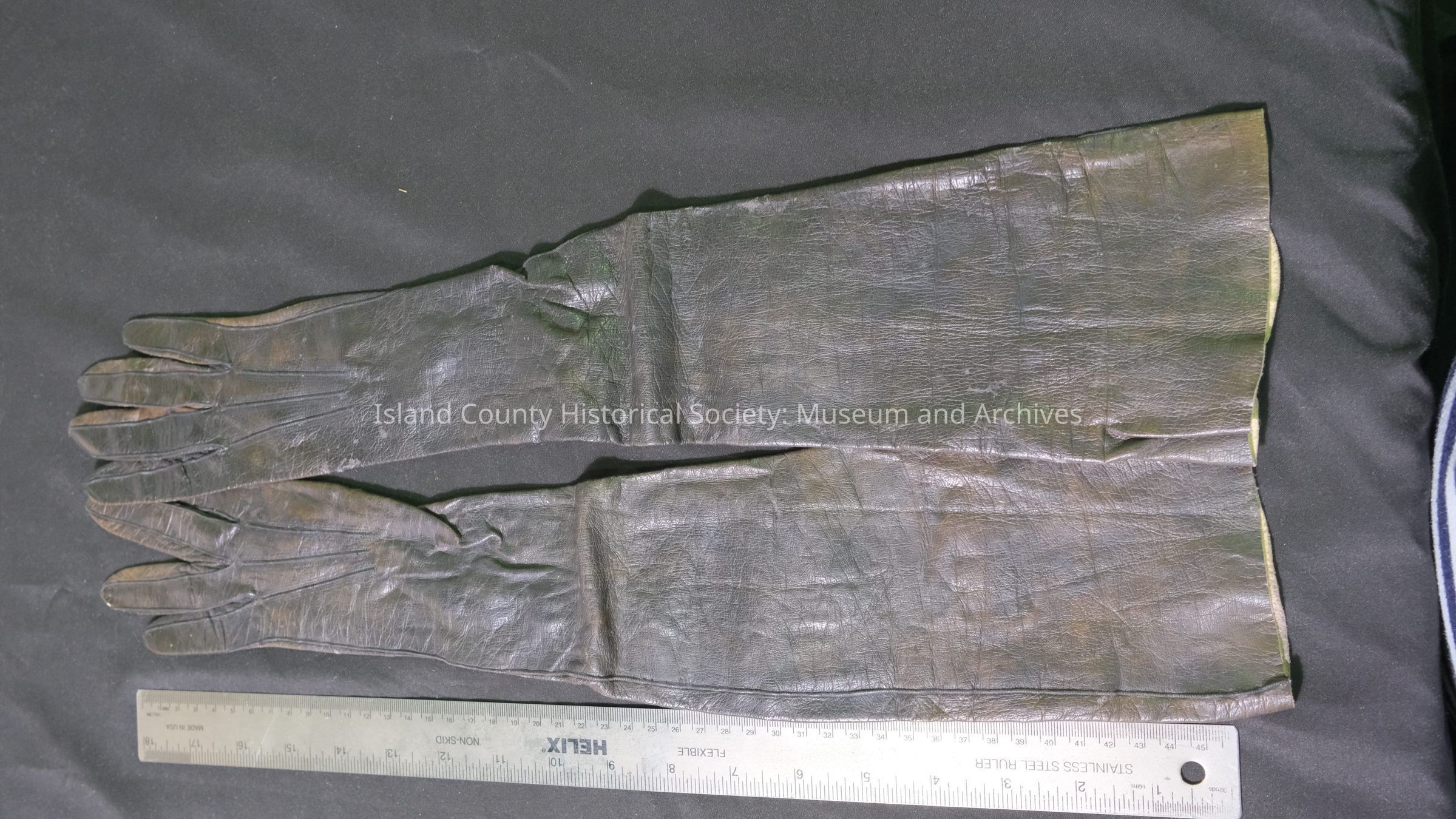 Elbow length black leather gloves, 3 buttons - worn by Athaleen Weedin.