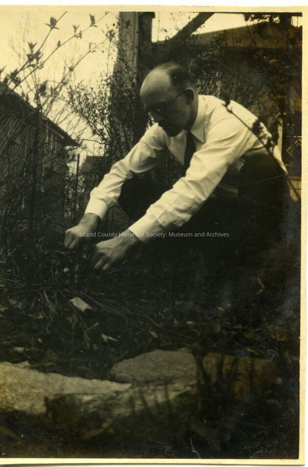 A black and white photo of a man possiably pruning a bush? He is in a garden and has his hands on a bush but the bush looks dead. The man is wearing a white shirt, a tie and glasses.