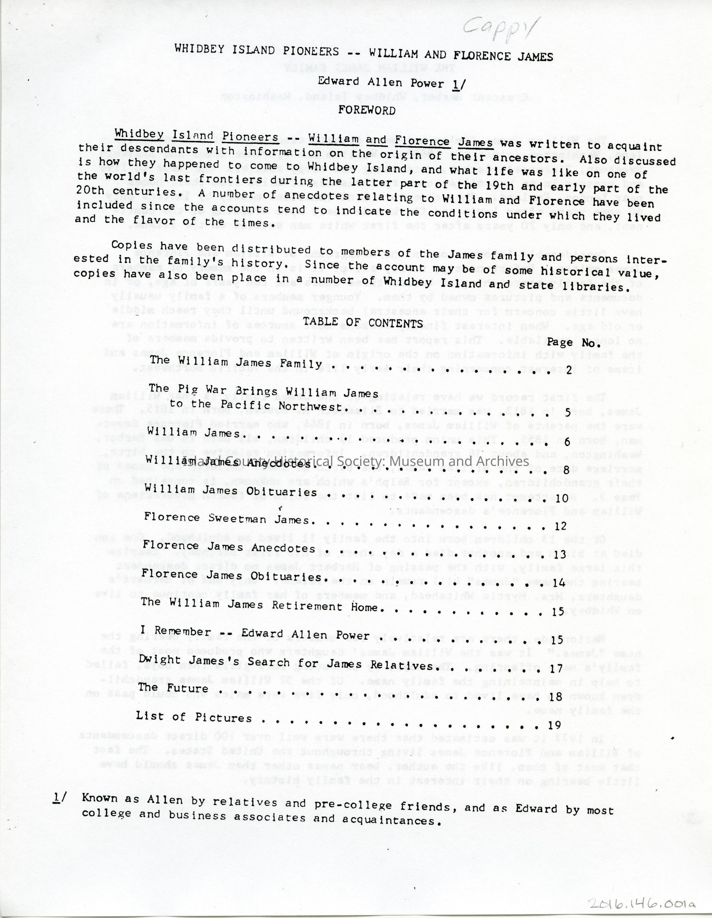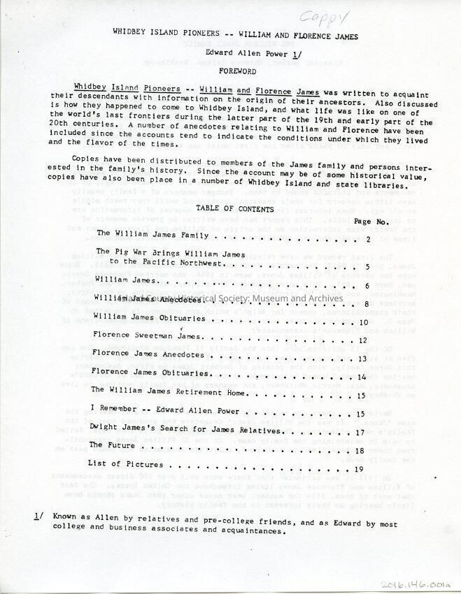 14 page copy of Whidbey Island Pioneers - William and Florence James. By Edward Allen Power. The document includes copies of photos of the James family. Pages are lettered a through n.