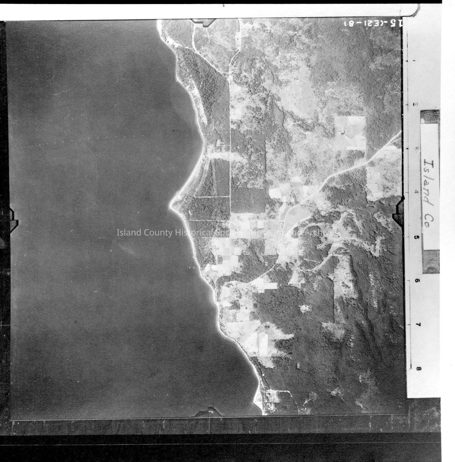 Donated by Island Conservation District Adjoins 2015.023.015 and 2015.023.017 Taken in the 1940s? 15-(E21-8) Most of the image is water. The eastern half of the image is a portion of Camano Island. Label: Island Co See GIS for digital copies