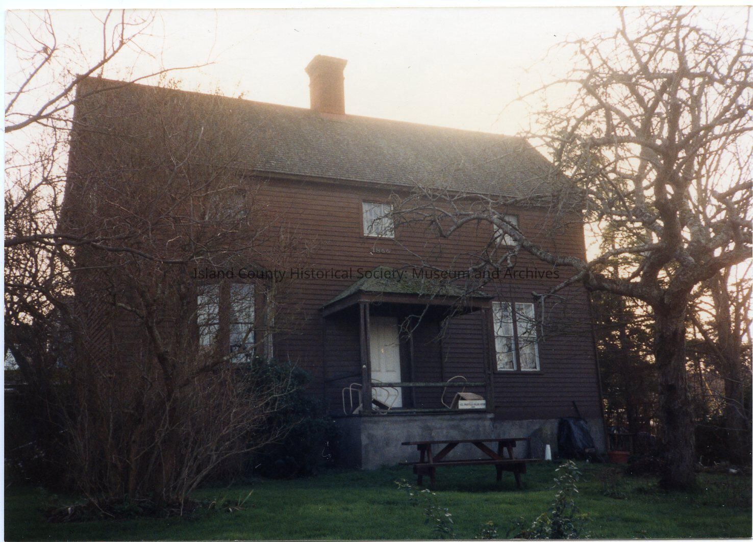 Photo of the building at 1 NE Front Street. built in 1866. It is known as the Haller House. Haller bought the house and lot in 1886 and enlarged it to its present size. The building is two story, at least one chimney, front door with small porch and portico, bay window on the left. Picnic table in the front.Made/Created
