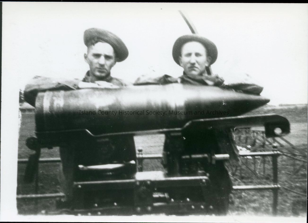Photograph of two individuals posing with a 10-inch artillery shell on a loading cart at Fort Casey, c. 1902-1913.Photograph Details