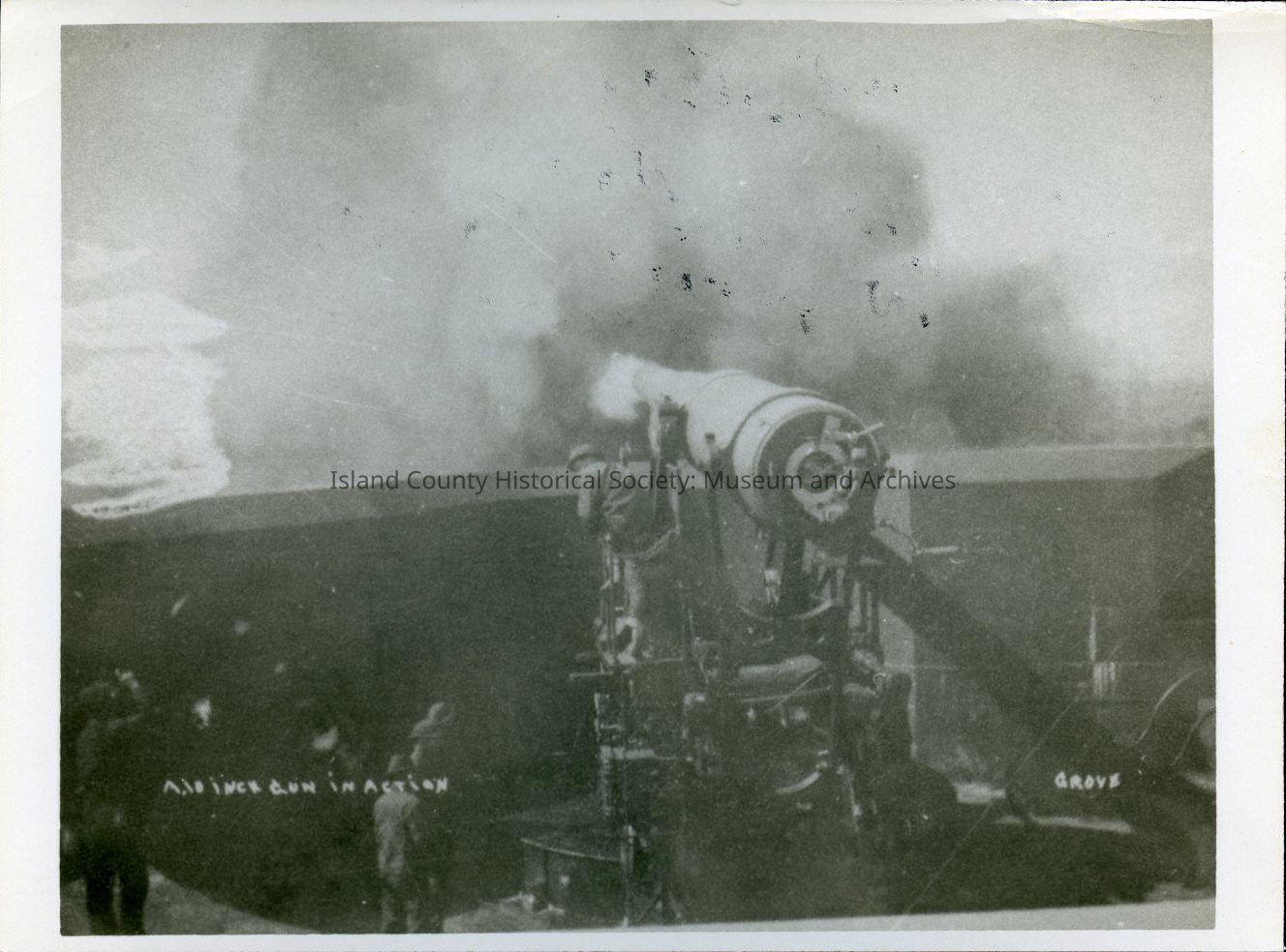 Photograph of a 10-inch gun being fired at Fort Casey. Photo by Perry Grove. C. 1902-1913.Photograph Details