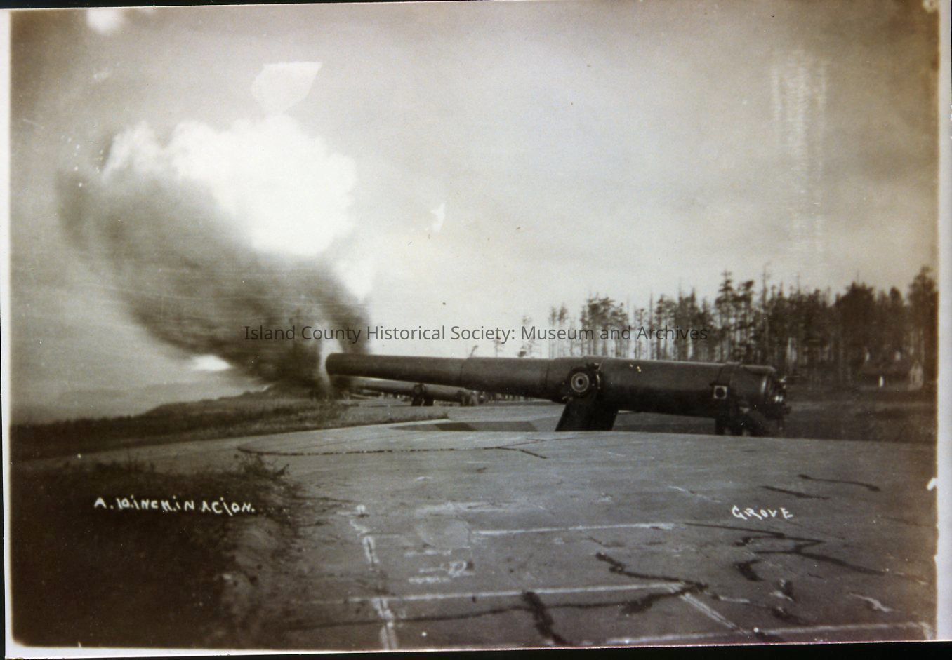 Photograph of a 10-inch gun firing at Fort Casey. Photo by Grove. C. 1902-1913.Photograph Details