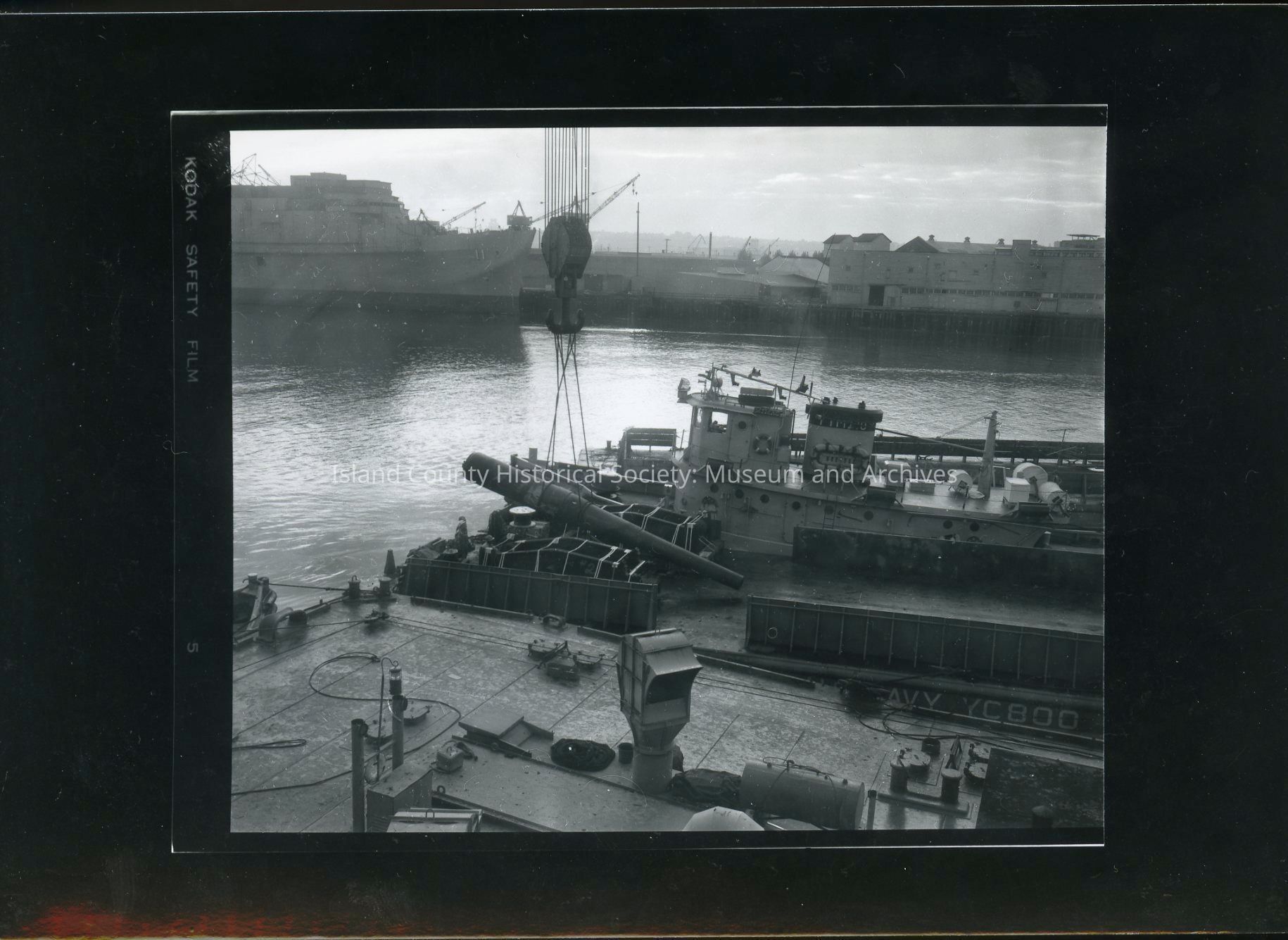 Photograph of a 10-inch gun tube being unloaded from a container ship at Harbor Island, Seattle. This gun tube was taken to Bremerton for refurbishing before being installed at Fort Casey in 1967. C. 1966-1967.Photograph Details