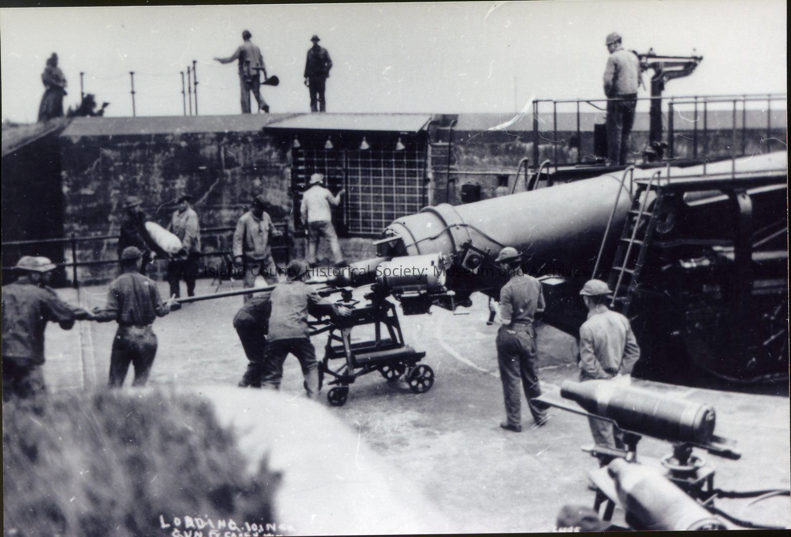 Photograph of a 10-inch rifle at Fort Casey on Battery Kingsbury being loaded. C. 1902-1913.Photograph Details
