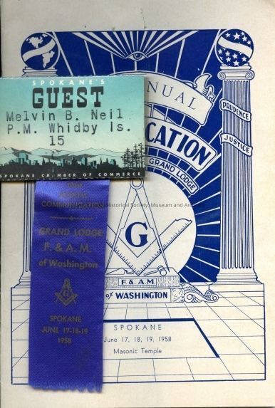 A program, nametag, and ribbon from the Grand Lodge of Washington's 101st Annual Communication, held June 17, 18, and 19, 1958 in Spokane. Nametag states: "GUEST, Melvin B. Neil, P.M. Whidby Is.,15". Inside of program features event itinerary and organizational leadership.