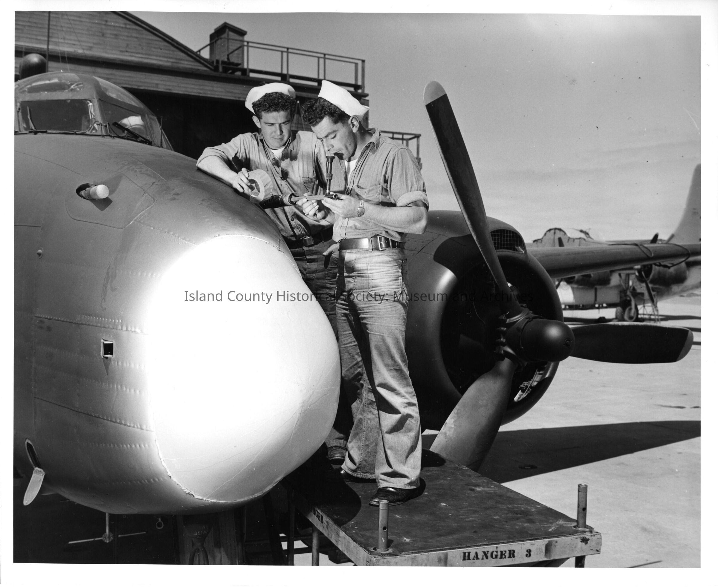 A photo of two Naval Air men working on a plane. Typed on the back is "U.S. Naval Air Station, Whidbey Island, Washington. WHID 4365 July 1945. Made for: Public Information Officer. Subject: Ordnance men boresighting 50-cal machine guns on PV-2 "Harpoon" aircraft.