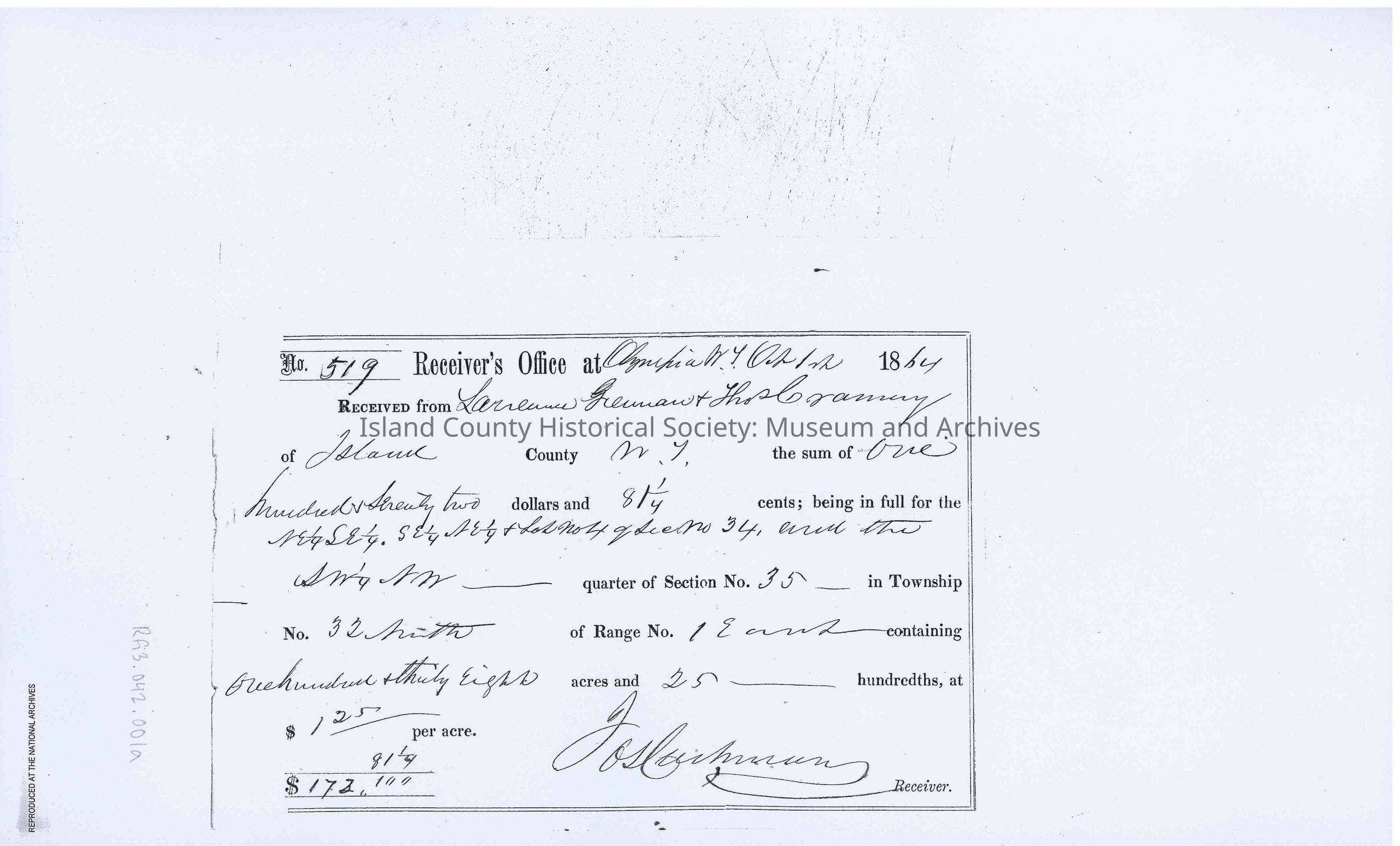 Photocopy of a cash entry/confirmation of payment on land plots in Section 35 in Island County, paid by Thomas Cranney and Lawrence Grennan, c. 1864, for the sum of $172.00.Collection