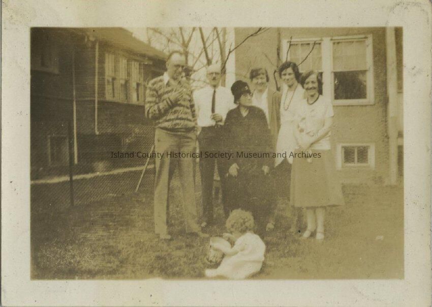 A black and white photo of a group of people standing in a backyard. There are two adult males, four adult females and a little girl. The little girl is on the ground in front of the adults and she has a bucket. Howard second from left, second from right is Alida and Patricia (Patsy) Kellogg on the ground.