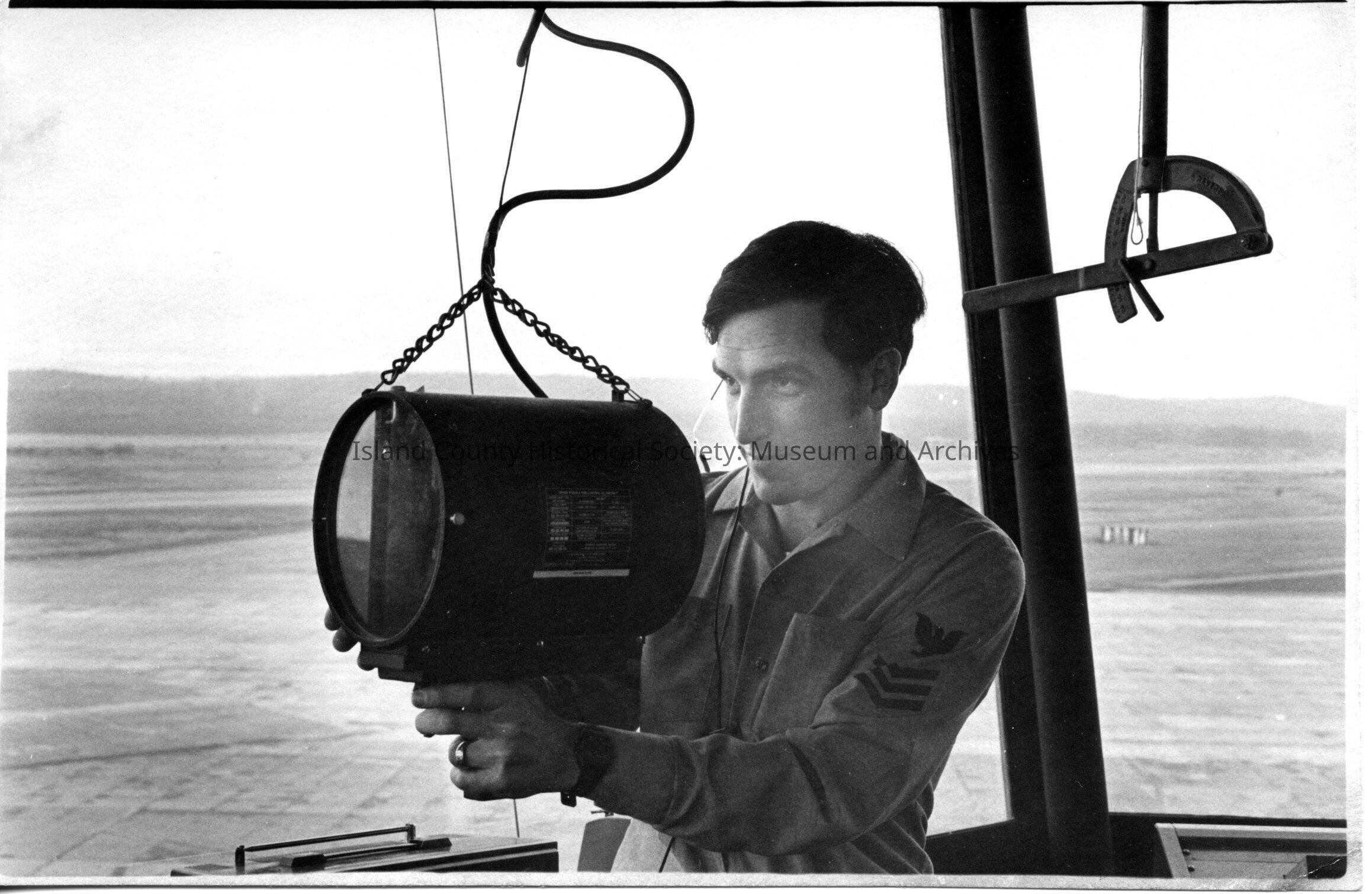 A photo of one Naval Air man working on a plane. Black and white photograph.