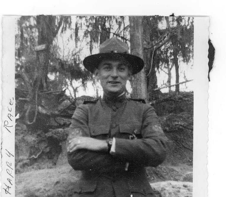 A black and white photo of a man in uniform. Handwritten on the front is "Harry Race in uniform."