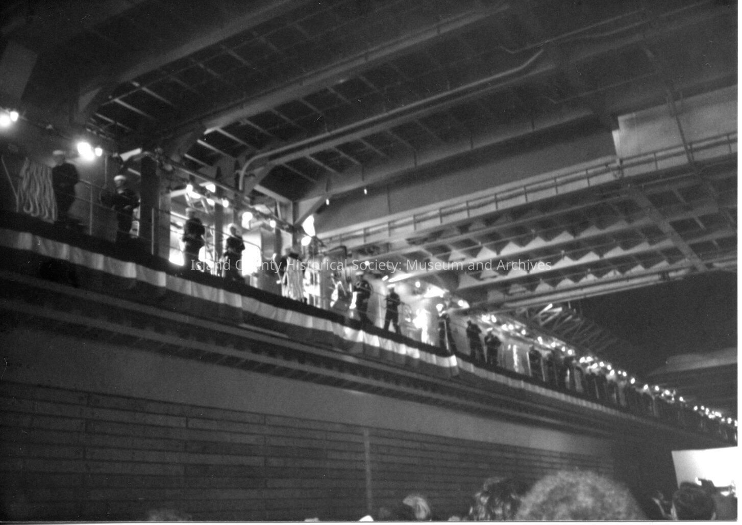 A photo of many Naval Air men walking along a high part of a hanger. Black and white photograph.
