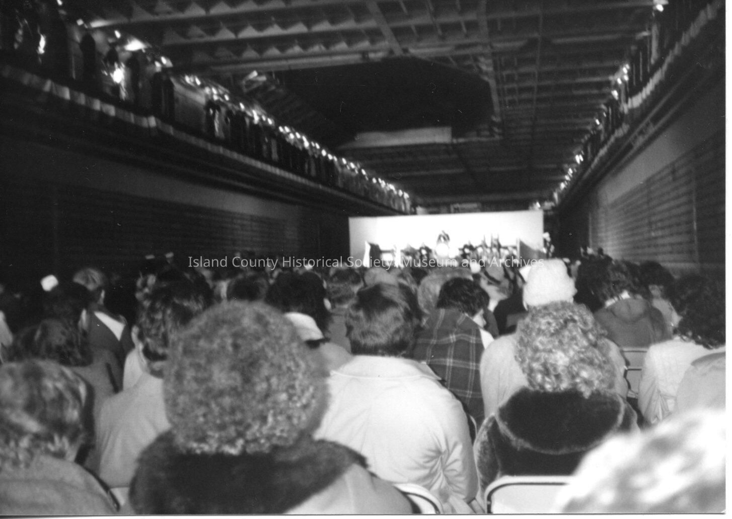 A photo of many people sitting inside a hanger watching something forward. Black and white photograph.