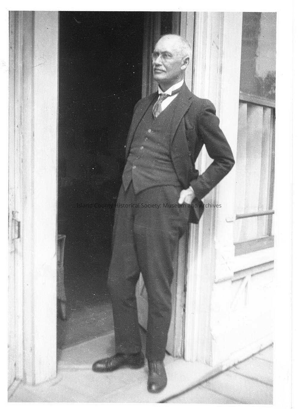 A black and white photo of a man standing in a doorway. Handwritten on the back is "Francis Puget Race, Druggist, Coupeville, Wash. Named for Puget Sound, the youngest son of his family who emigrated from Australia. All other children had Australian geographic names."Made/Created