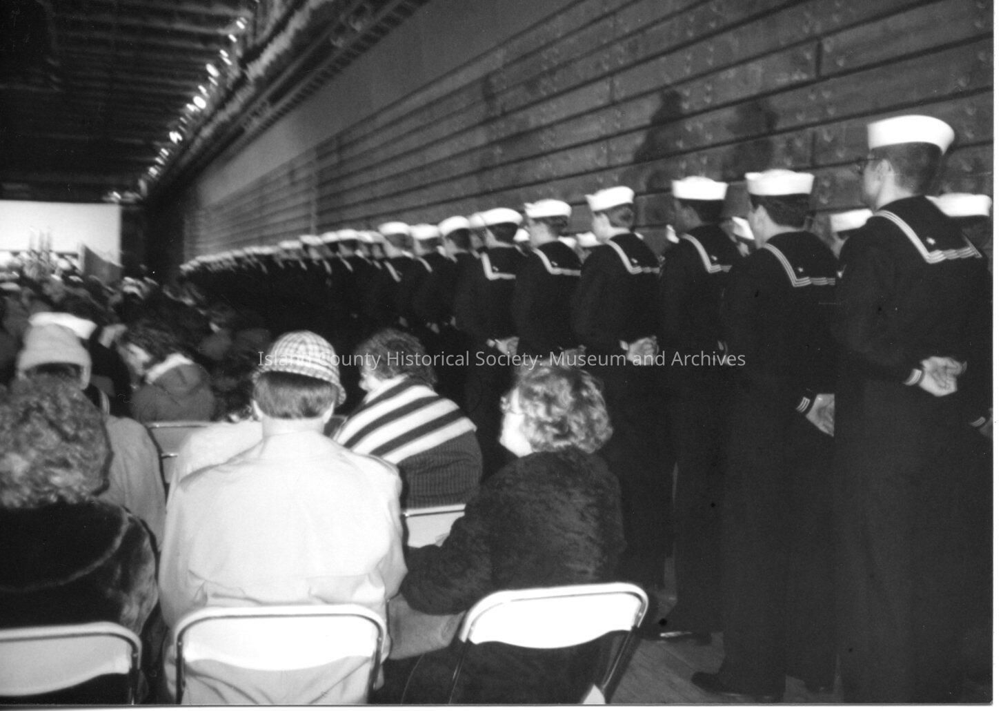 A photo of many people sitting inside a hanger with navy men in uniform standing along the side. Black and white photograph.