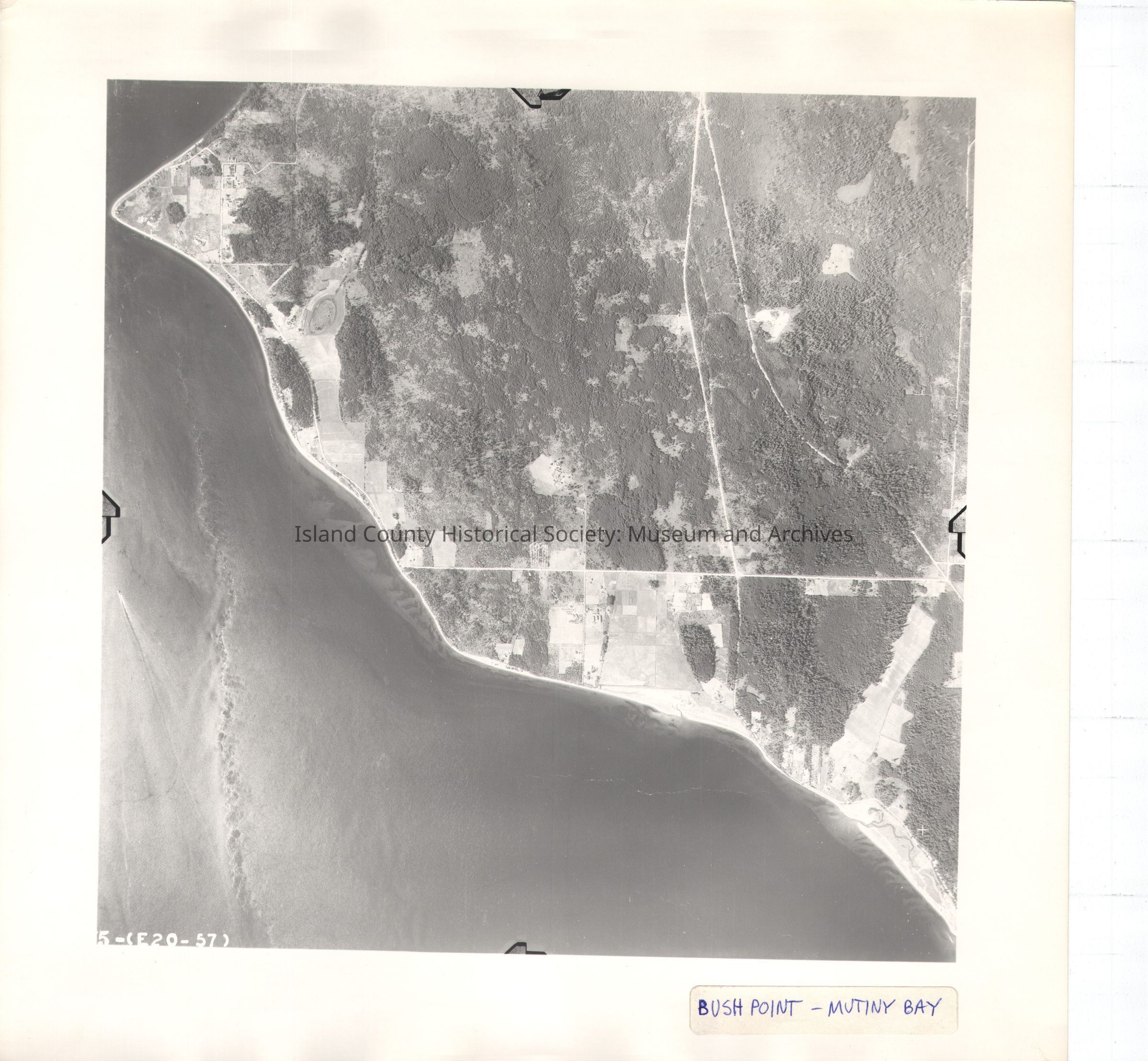 Donated by Island Conservation District Adjoins 2015.023.022 and 2015.023.024 Taken in the 1940s? 15-(E20-57) Half land and half ocean, cut diagonally. Bush Point, Mutiny Bay Label in ink: Bush Point Mutiny Bay See GIS for digital copies