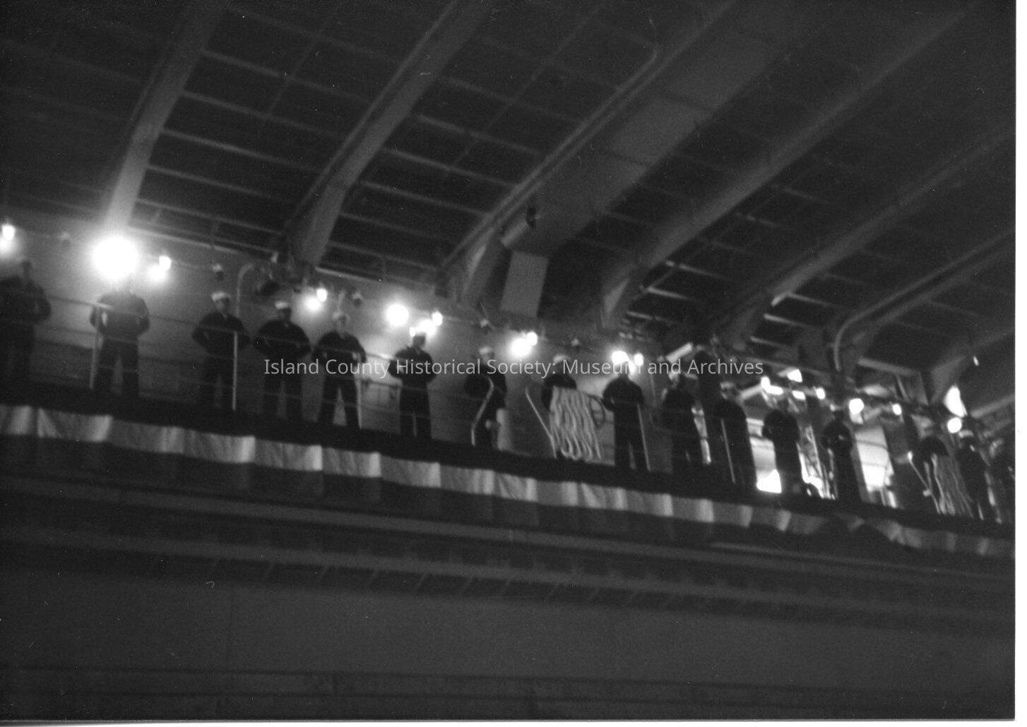 A photo of navy men standing at ease on a high place inside a hanger. Black and white photograph.