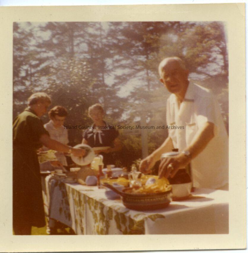 Color photograph of a man wearing a white short-sleeve shirt, standing at a picnic table. Behind him are three women standing at the other end of the long table. Trees are behind them. Related photos: 2015.086.008-2015.086.015.