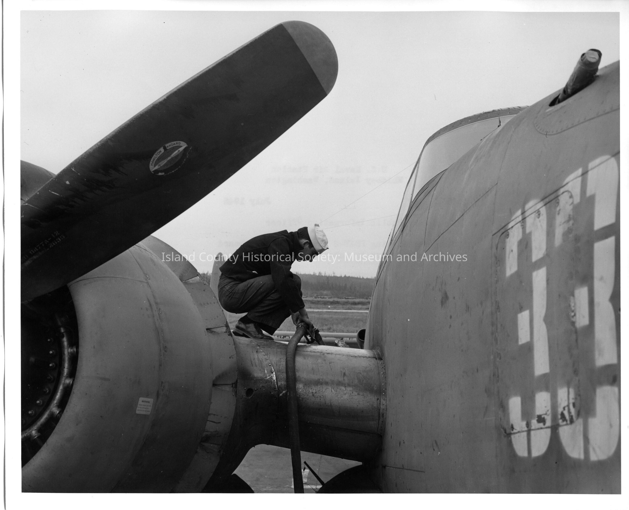 A photo of a navy man squatting on a part of a plane, working on it. Typed on the back is " U.S. Naval Air Station, Whidbey Island, Washington. WHID 4367 July 1945. Made for: Public Invormation Officer. Subject: Gassing PB4Y-2 "Privateer" starboard wing-tanks prior to takeoff."