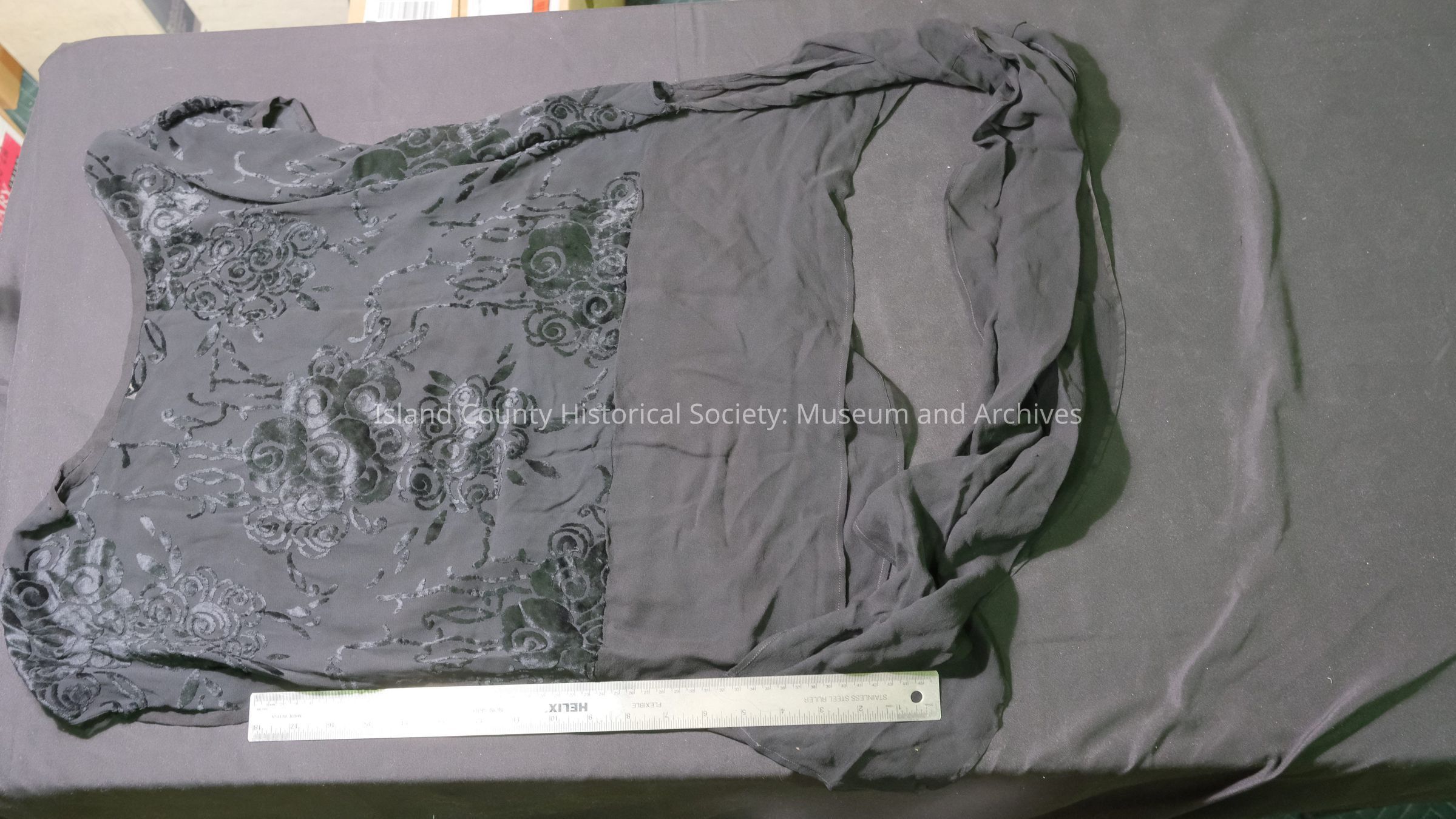 Black, cut velvet georgette blouse with sash. Worn by Athaleen Weedin late 20's