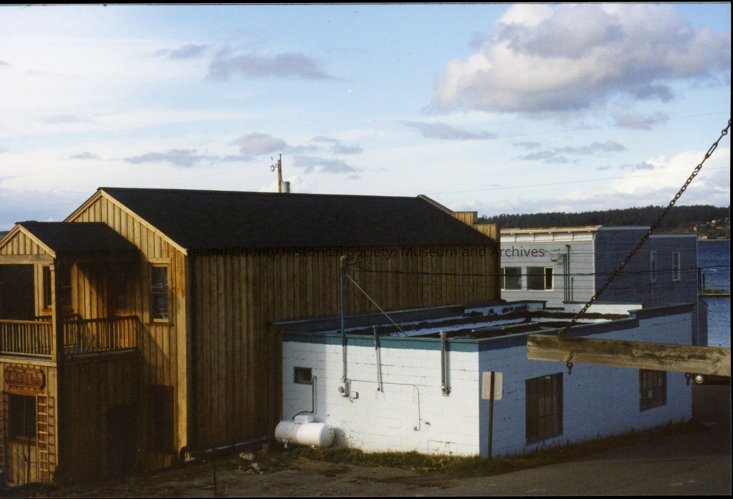 Rear view of #11 (right) and #13 (left) NE Front Street, Coupeville. #16 NW Front Street is visible in the background (blue building; Kingfisher Book Store). C. 1997-1998.Photograph Details
