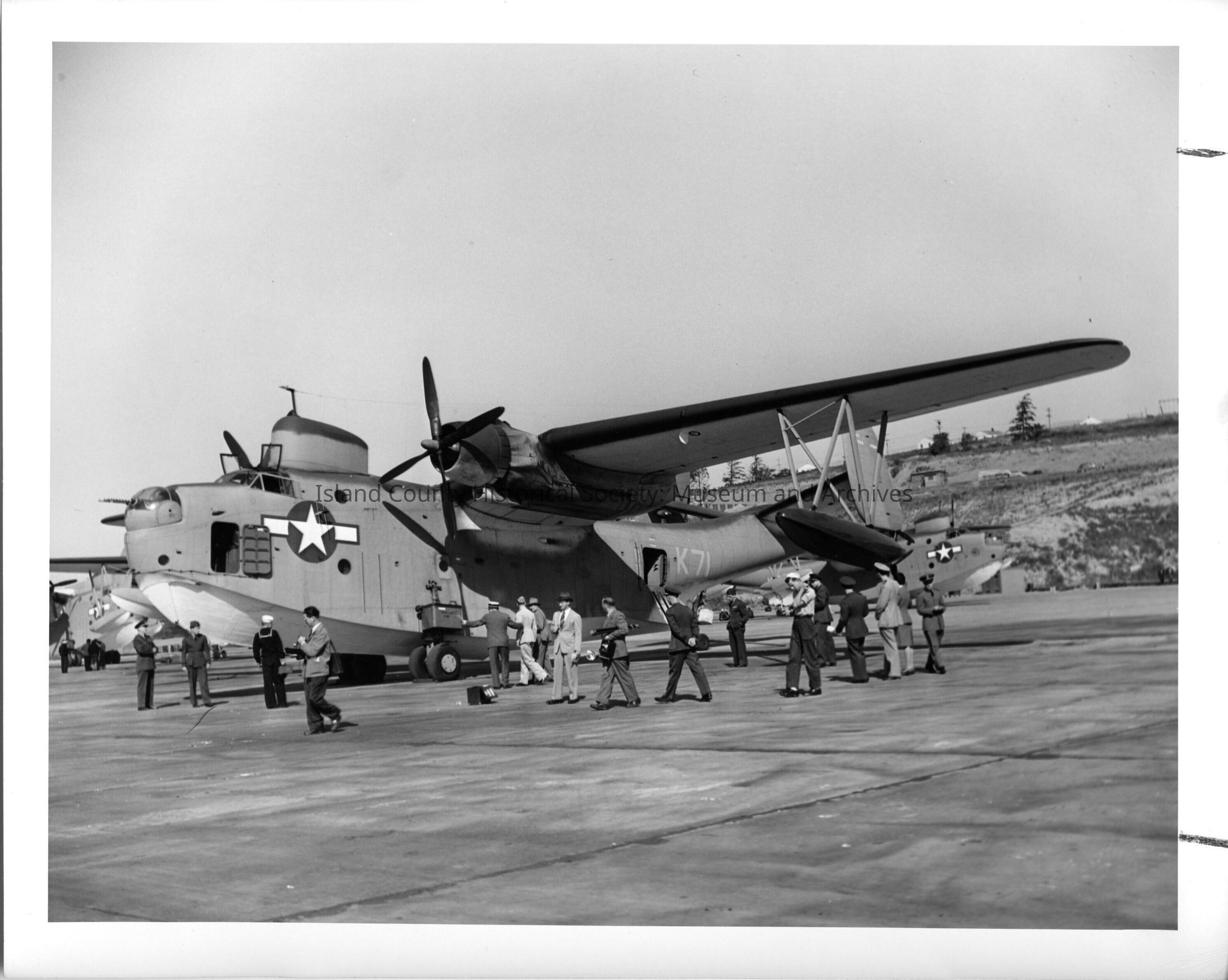 A photo of several navy men and a few regular men in suits outside a nave plane. Handwritten on the back is "3 Cal, P5M." Black and white photograph.