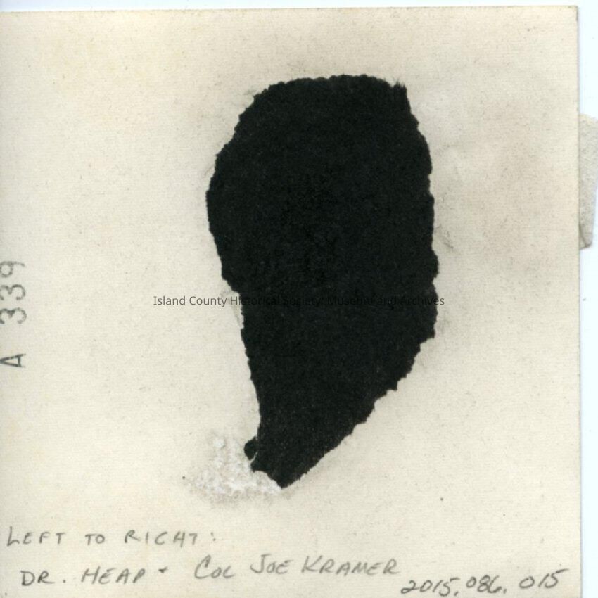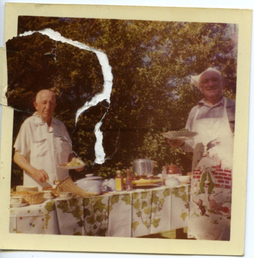 Color photograph of a man wearing an apron and hat, at a picnic table outside. Beside him is a man wearing a white short-sleeve shirt. Both men are facing the camera. Trees are behind them. On the back: "Left to right: Dr. Heap Col Joe Kramer"