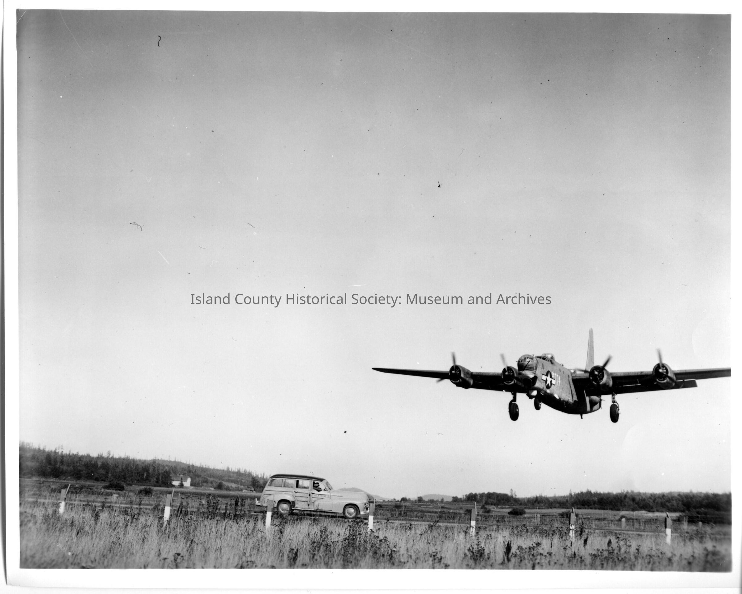 A photo of a navy plane flying over land where there is a car and a man watching. Typed on the back is "PB4Y-2 "Privateer" landing at Ault Field, NAS Whidbey Island, Oak Harbor, Washington. August 28, 1945. National Archives Negative Number 80-G-278239." - on an attached piece of paper.