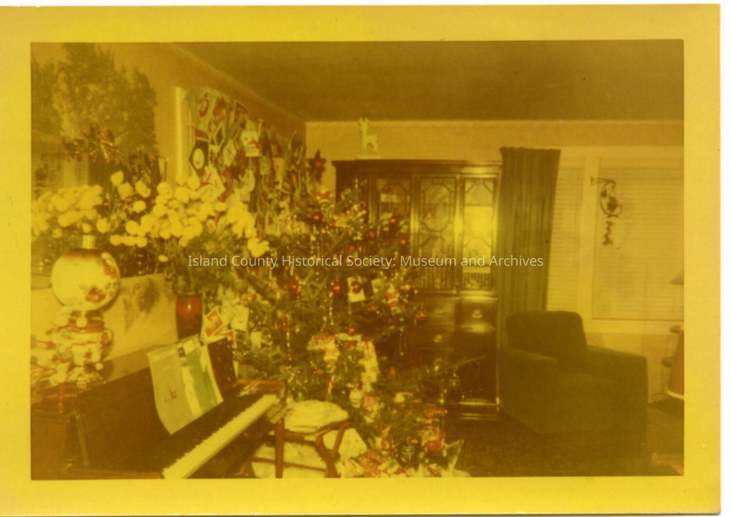 Color photograph of a room with a piano and Christmas tree and other Christmas decorations. Arm chair. China cabinet. Related photos: 2015.086.016-2015.086.023 and 2015.086.032-.033.