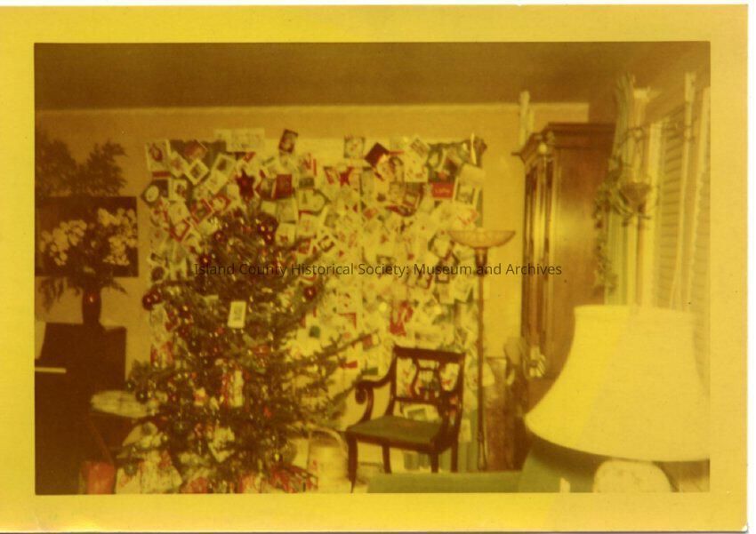 Color photograph of a room with a Christmas tree and other Christmas decorations. Captain's chair. China cabinet. Piano. Many Chrismas cards behind the tree. Related photos: 2015.086.016-2015.086.023 and 2015.086.032-.033.