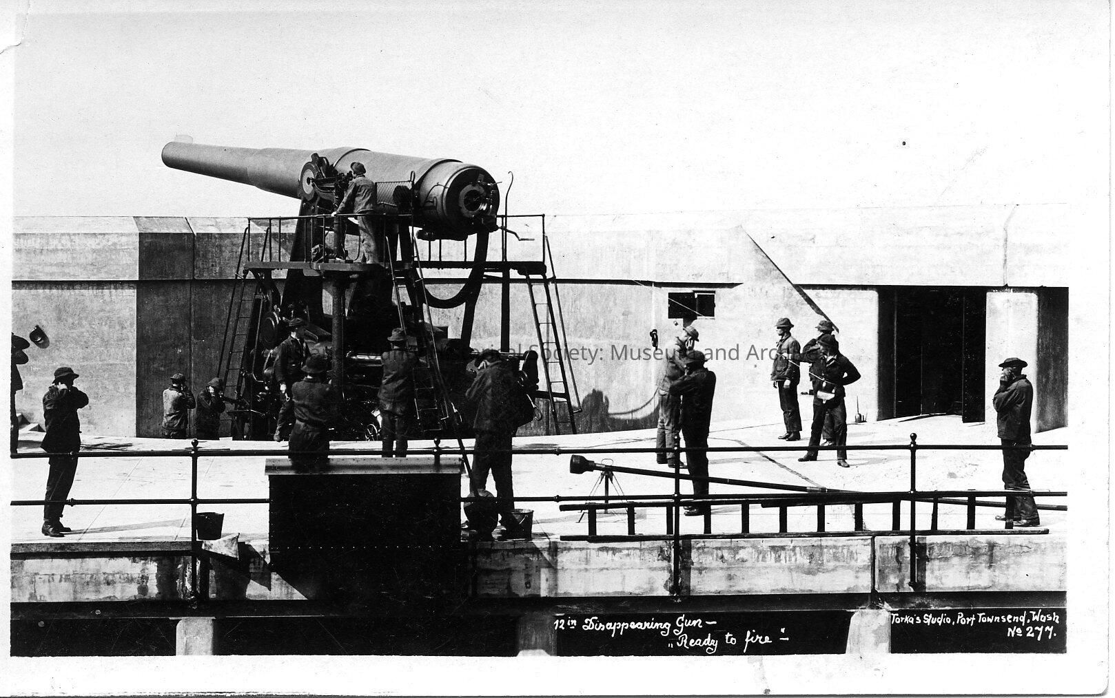 Ft. Worden. Soldiers at 12 in. gun in battery. One soldier stands on gun platform. Thirteen soldiers and spectators watch from rear and gun well; some hold hands over their ears. Print at bottom reads: 12 in. disappearing gun - "ready to fire."