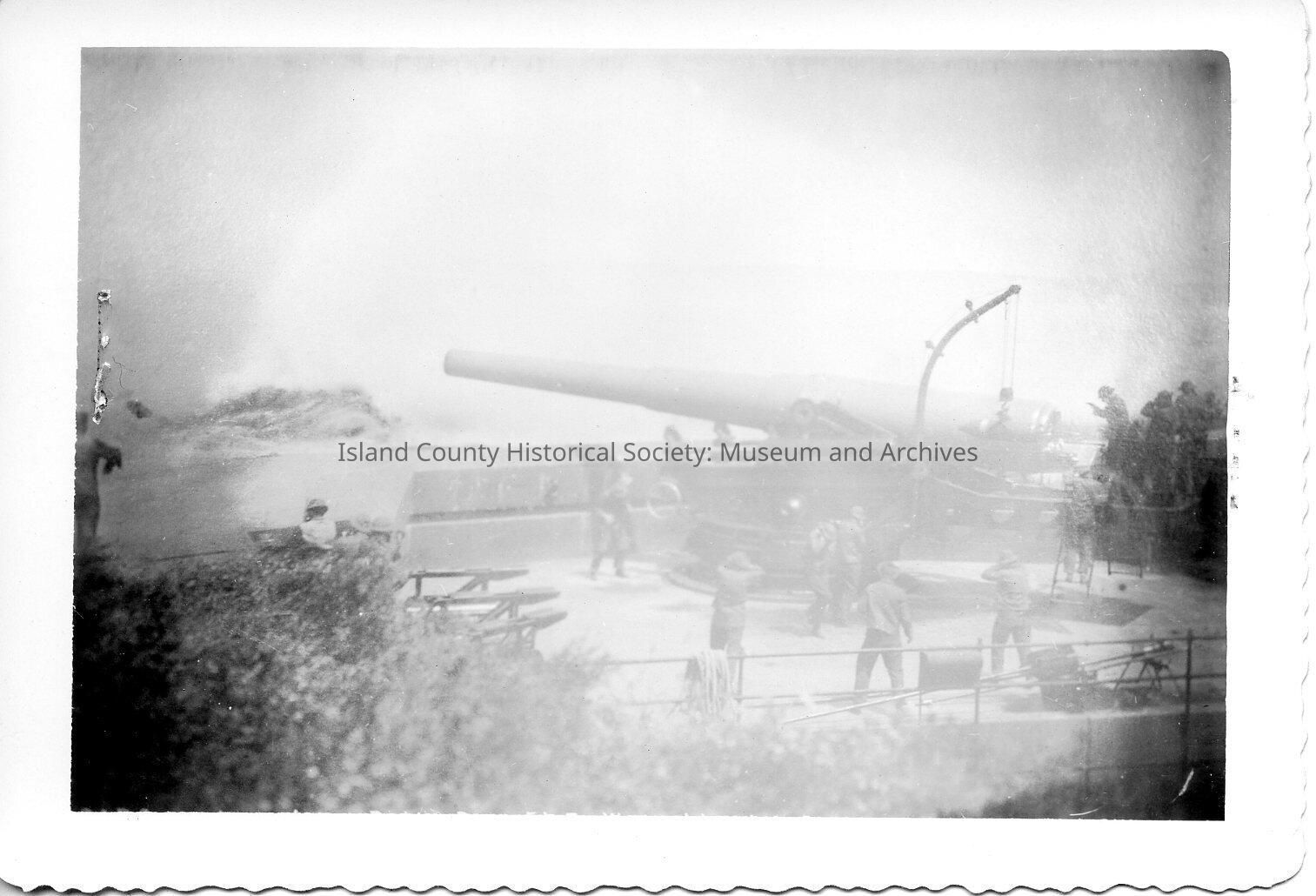Battery Ash, Ft. Worden. Soldiers at gun in battery. Soldiers stand in various positions near gun; some hold hands over their ears.