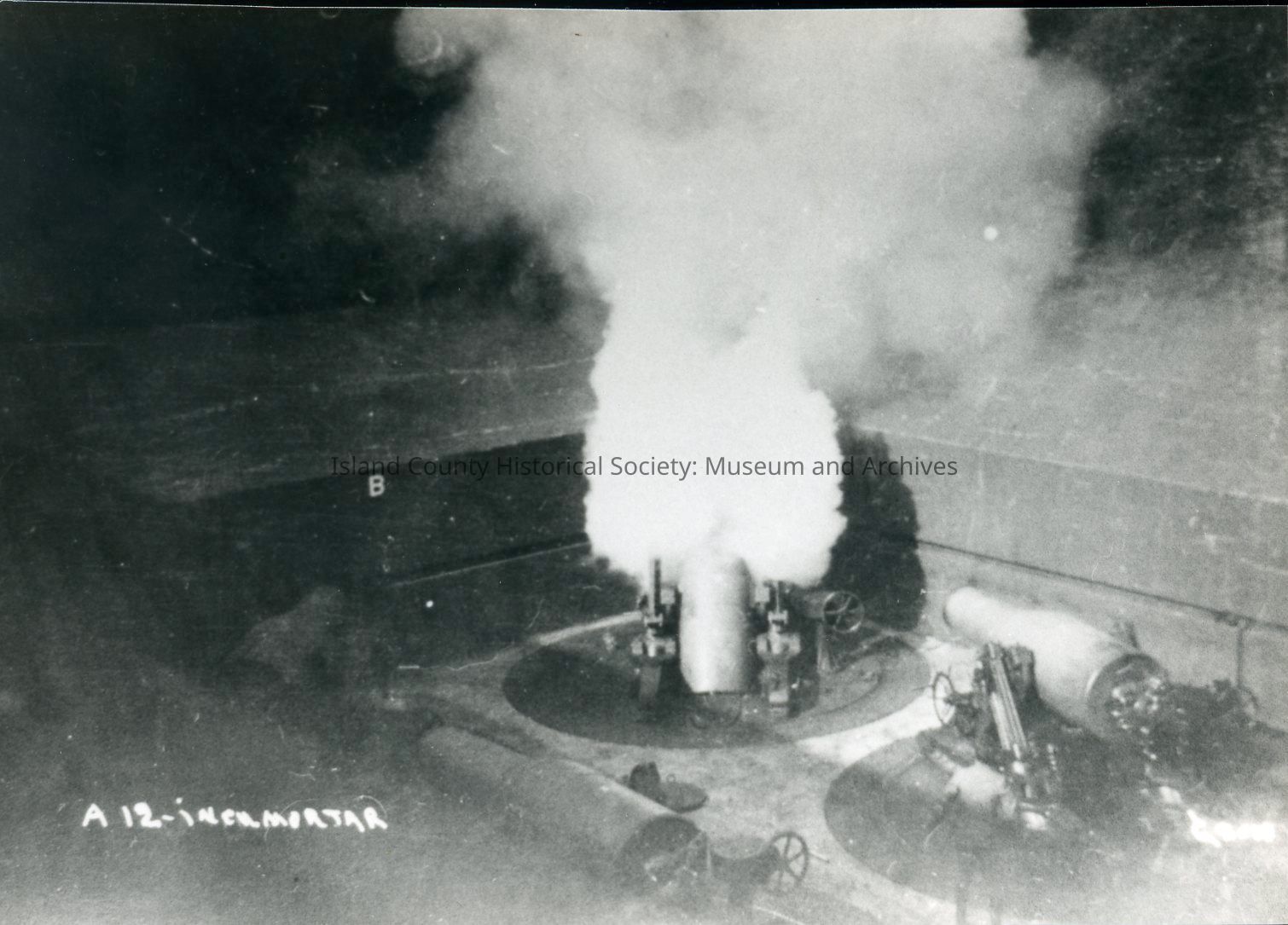 Photograph of a 12-inch mortar firing at Fort Casey. Likely c. 1902-1930.Photograph Details