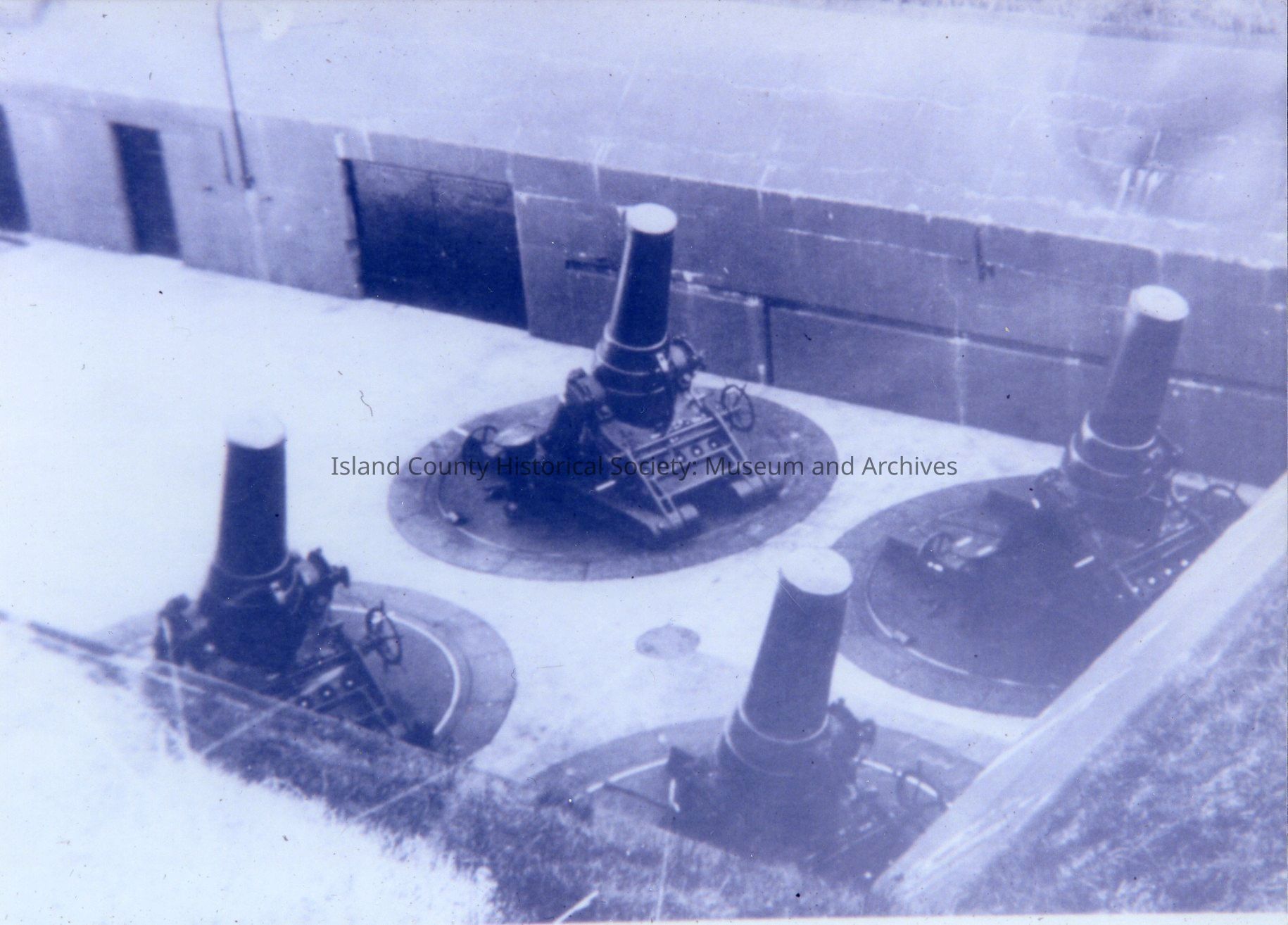 Photograph showing four 12-inch mortar guns at Fort Casey, c. 1903-1914.Photograph Details