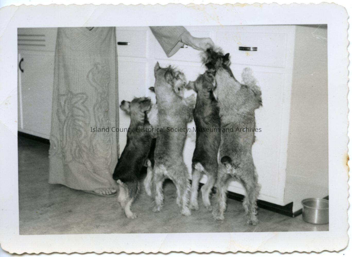 Black and white photograph of five dogs standing on hind legs beside a woman in a robe. Related photos: 2015.086.035-.036 and 2015.086.039.