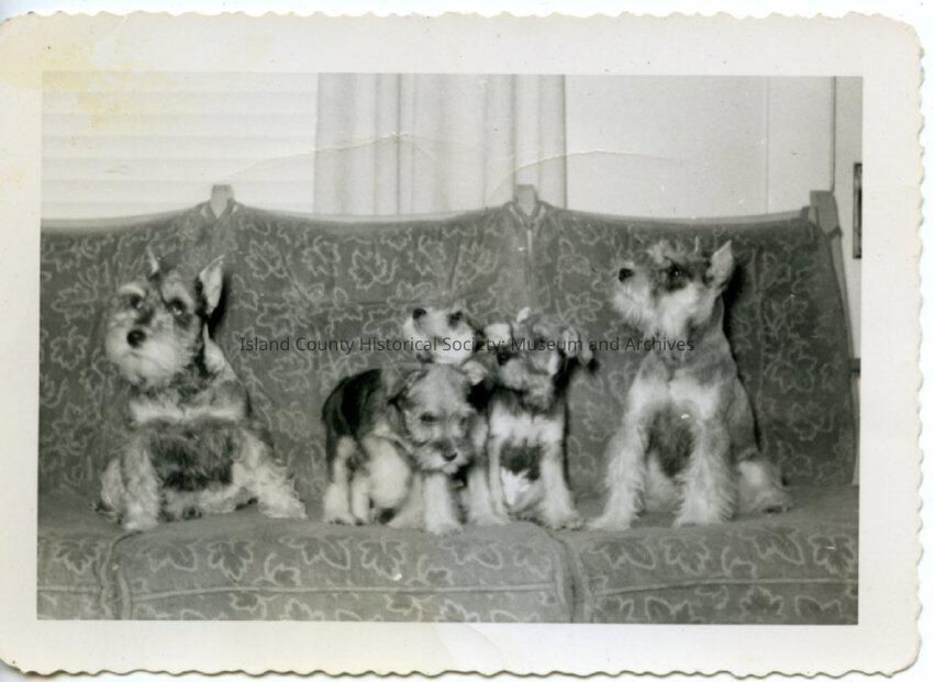 Black and white photograph of five dogs sitting on a sofa. Related photos: 2015.086.035-.036 and 2015.086.039.