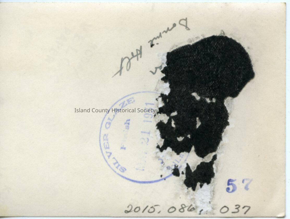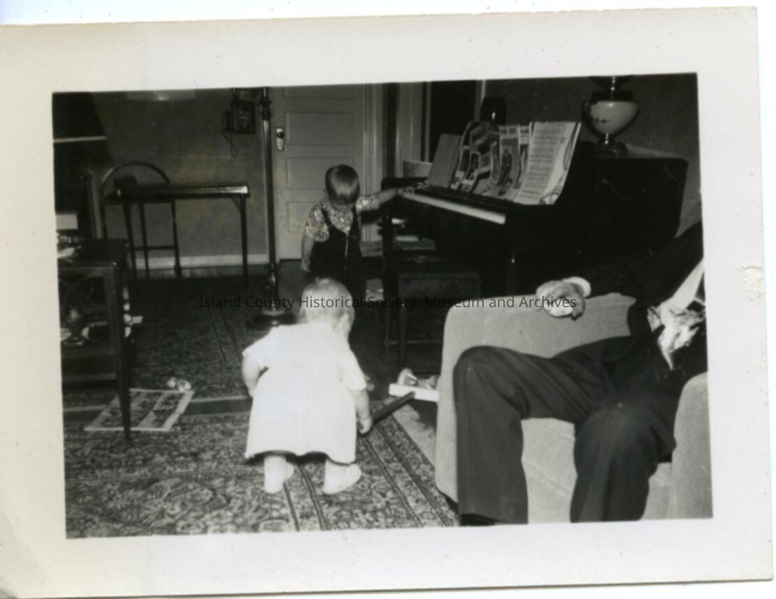 Black and white photograph of a small child on a rug in front of a chair. A goy is standing at the piano in the background. On the back: Silver Glaze Finish. May 21, 1951. Written on the back: "Donnie Holt"