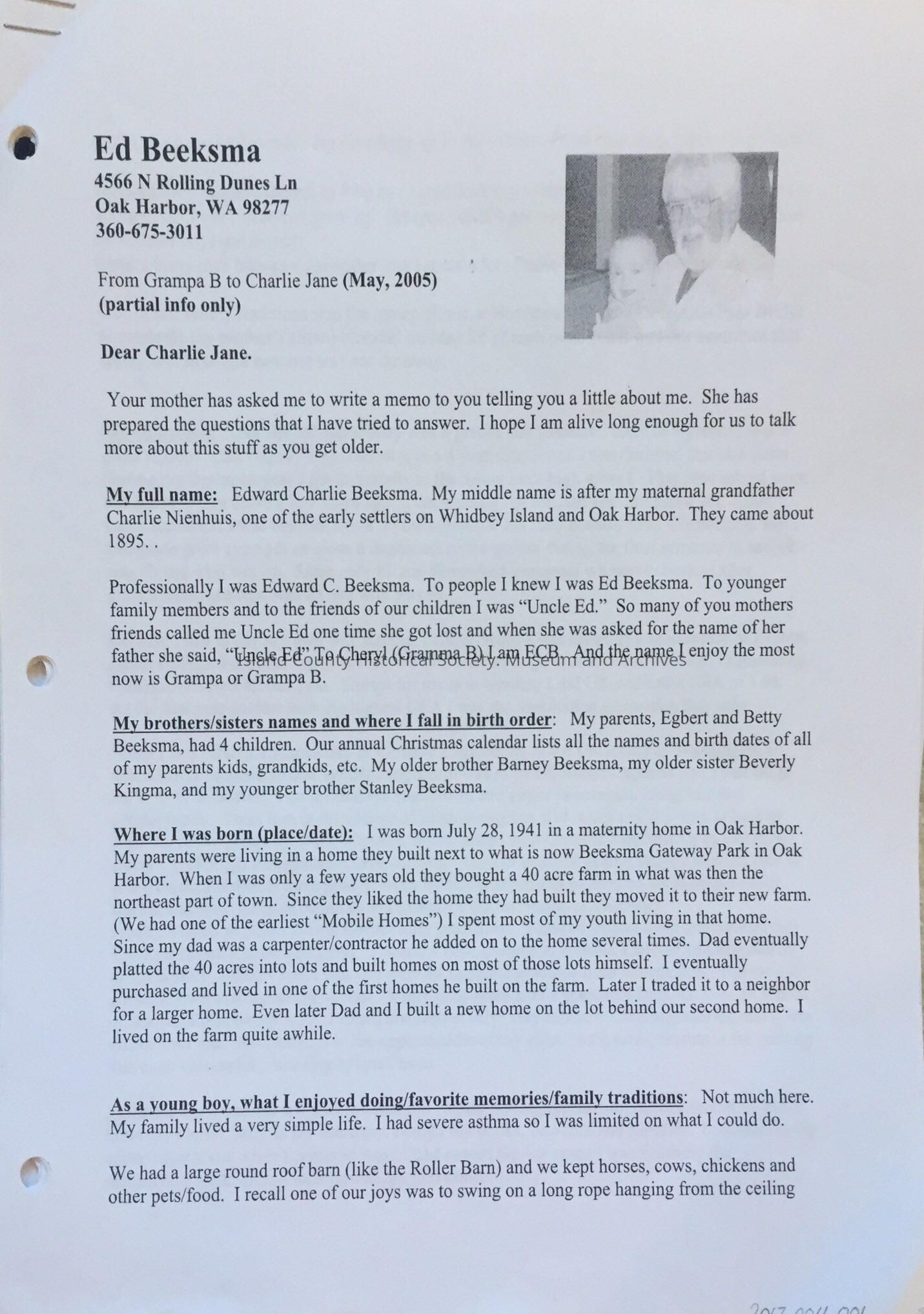 Ed Beeksma writes a letter to his granddaughter Charlie Jane. It explains his personal and family history. Many events on Whidbey Island is chronicled in this 12 page letter.