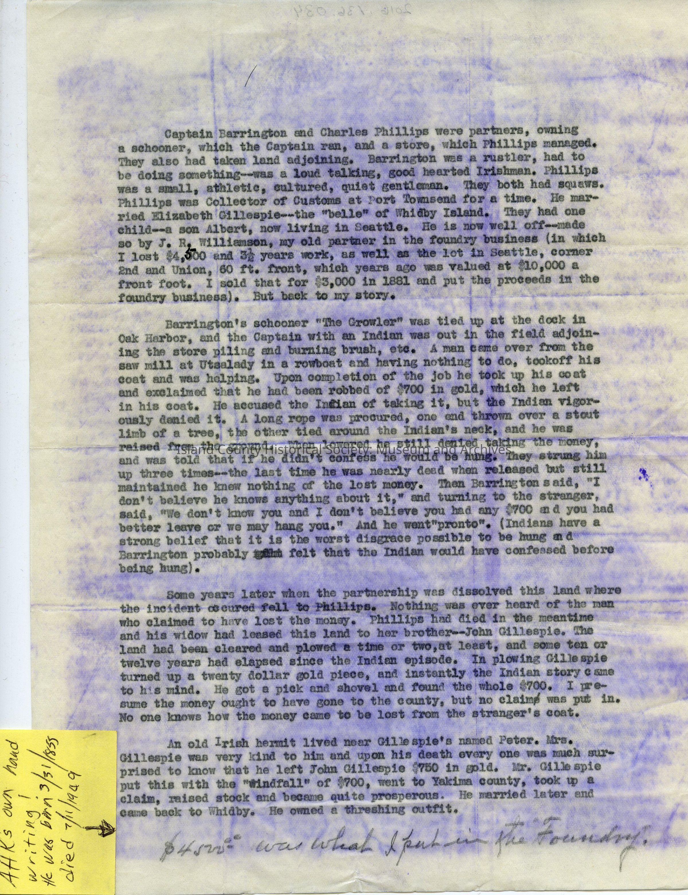 Typewritten, one page write up of Captain Barrington and Charles Phillips, partnership, "Growler", Gillespies. At the bottom of the page is a note; a sticky note indicated this was in AHK's own hand writing! He was born 3/31/1855 died 7/11/1949. (Sticky note removed).