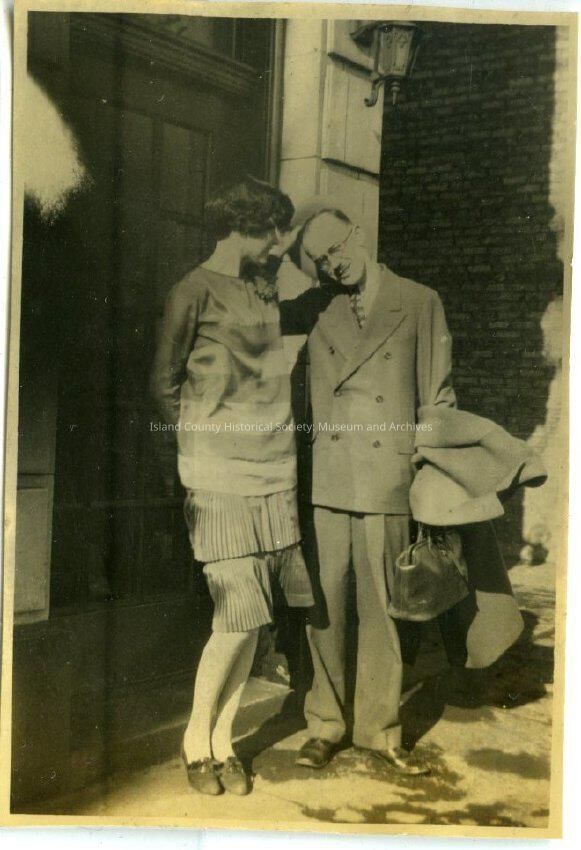 A black and white photo of a couple standing outside of a door. The man is wearing a suit, hat, and is carrying a jacket and bag. The woman is wearing a dress and is looking at the man. The background is part of the door and part of a brick building. Howard and Alida Kellogg in Chicago.