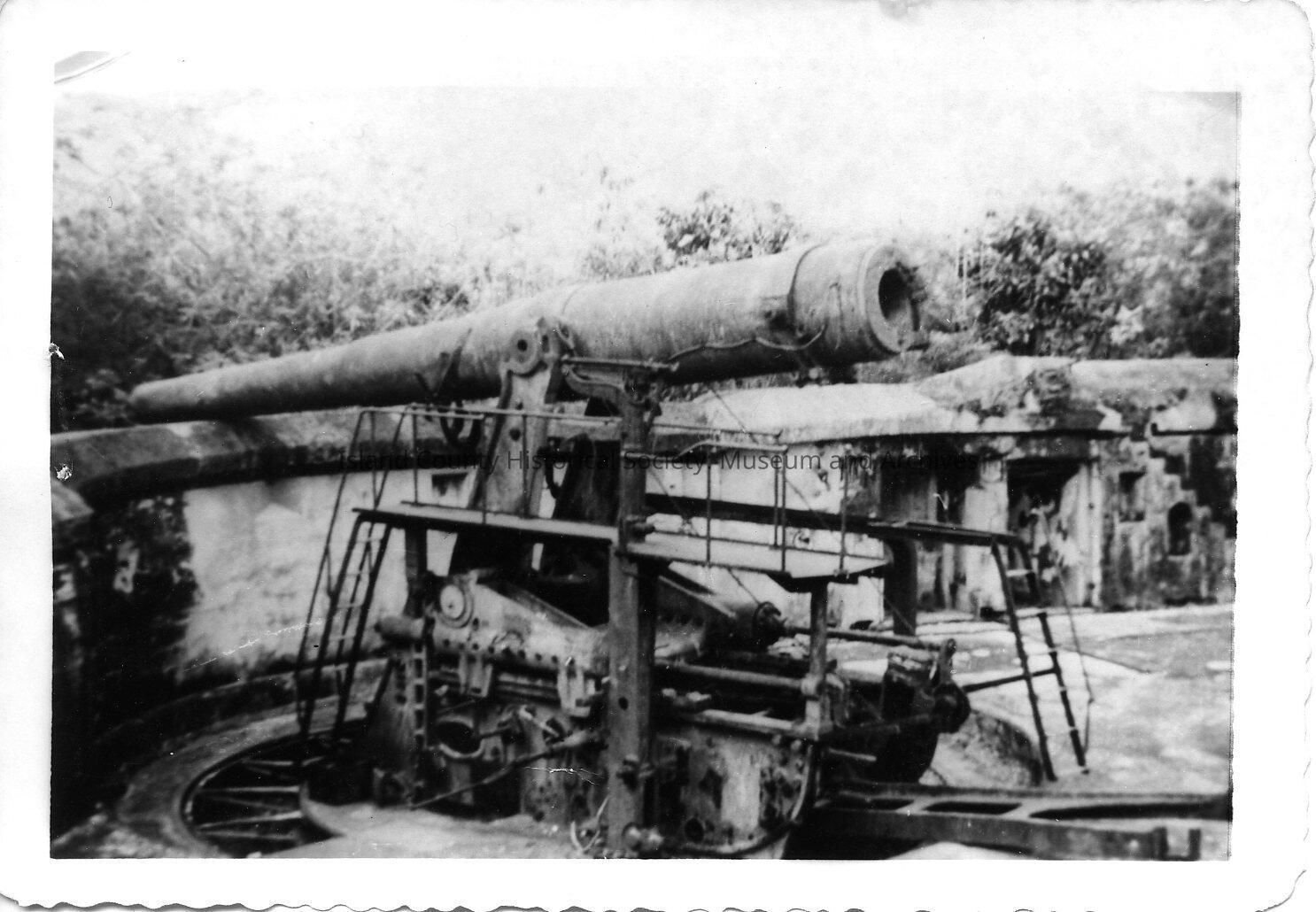 Ft. Wint, Phillipines. Old disappearing gun stands in battery. Gun barrel rests on wall. Vegetation surrounds battery. Gun and battery appear to be abandoned. From old entry: Photo with negative of "Ft. Wint, P.I."